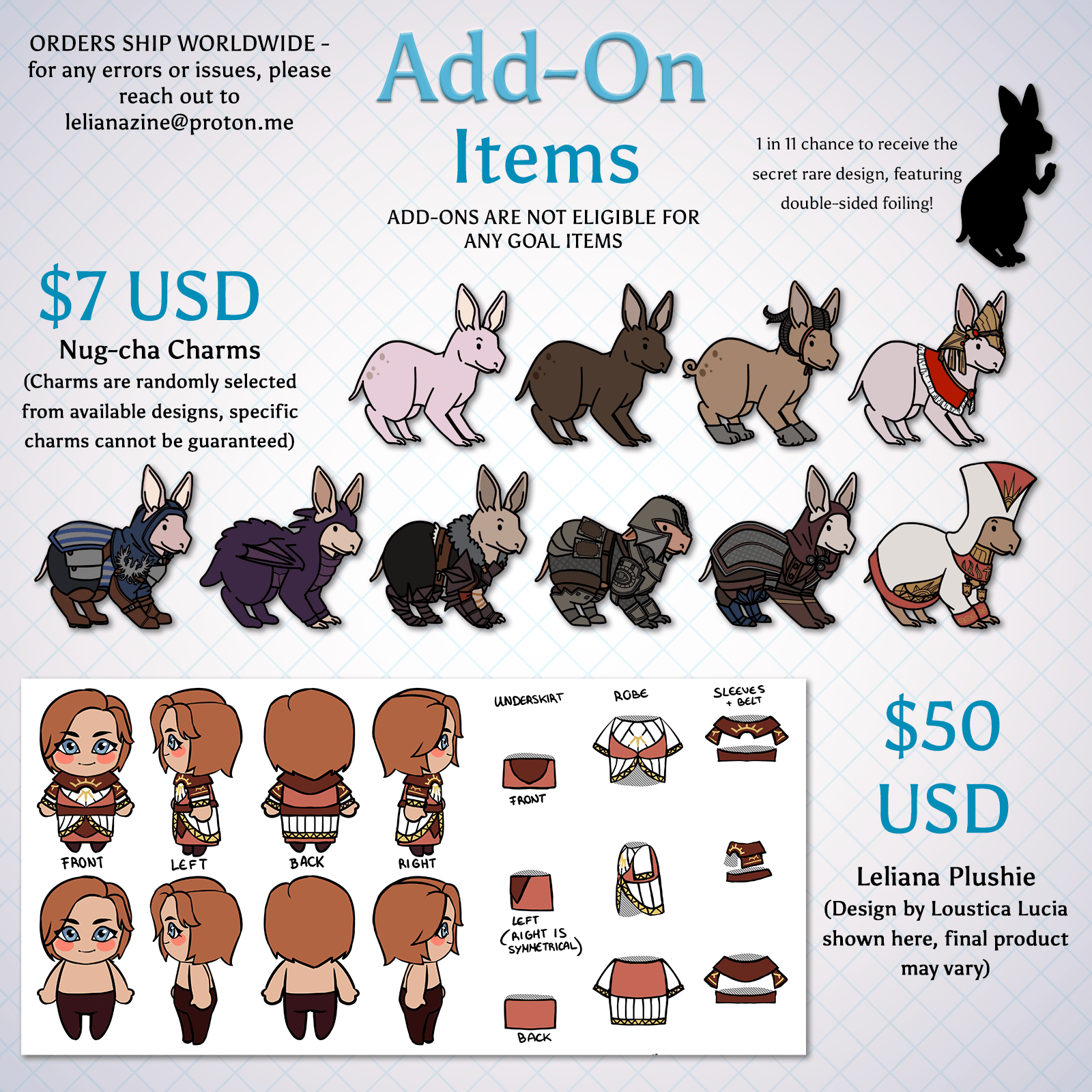 Our current add-ons are our "nug-cha" (nug gacha) small acrylic charm set that is randomized OR for slightly more you pick what ones you want. And our other add-on is our Leliana plushie, which you can get at a discounted price bundled with any of our other physical listings!